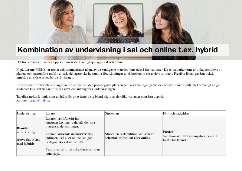 Kombination av undervisning i sal och online t.ex. hybrid (PDF, 199 KB), Mälardalens universitet (MDU).